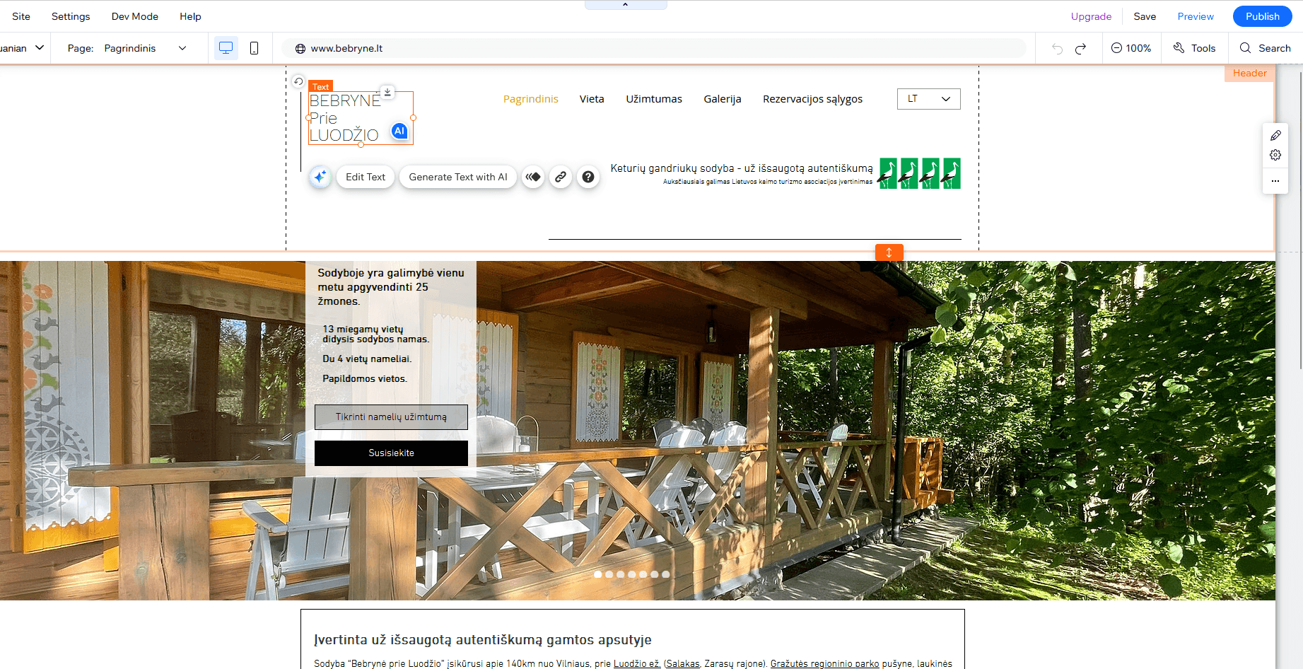 Svetainė „BEBRYNĖ prie Luodžio“ buvo sėkmingai atnaujinta – pritaikytas modernus dizainas, užtikrintas sklandus domeno ir hostingo perkėlimas, sutvarkyta el. pašto sistema. Svetainėje integruota dinamiškai atsinaujinanti „Google Sheets“ lentelė, o atlikta SEO optimizacija pagerino matomumą paieškos sistemose. Galutinis sprendimas veikia stabiliai, greitai ir atitinka šiuolaikinius vartotojų lūkesčius.